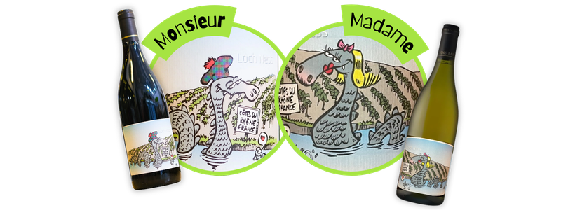 Julien choisit alors un animal mythique : le monstre du Loch Ness. Un animal auquel on ne croit pas parce qu’on l’a vu, mais parce qu’on a envie d’y croire. Très vite, une évidence s’impose : il ne peut pas être seul. Il y aura Madame. Et il y aura Monsieur. Sur les étiquettes, on les voit nager sur le Rhône, devant les coteaux des Côtes-du-Rhône. Ils avancement tranquillement jusqu’à se rencontrer inévitablement.